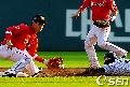 [OSEN=잠실,박준형 기자] 24일 오후 서울 잠실구장에서 열린 '2011 롯데카드 프로야구' LG 트윈스와 SK 와이번스의 경기 1회말 무사 1루 LG 이진영의 타석때 1루 주자 이택근이 2루 도루 시도했으나 SK 최윤석 유격수에게 태그아웃되고 있다. / soul1014@osen.co.kr